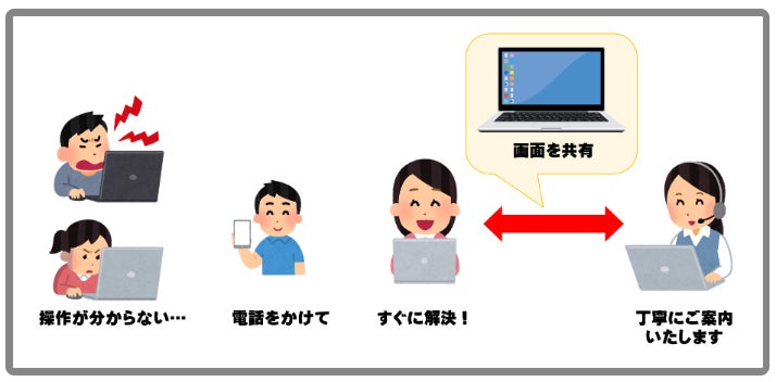 授業後の分からないことは、すぐに解決できます! テクニカルサポート専用ダイアルにご連絡頂ければ、学園スタッフがリモートソフトでお客様と画面を共有しながら丁寧にご指導致します