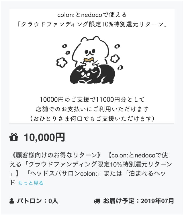 先月26日よりスタートさせていただいております「クラウドファンディング」におきまして、支援していただくと支援金額に応じて新製品やサービスをお返しする「リターン制度」の中で《顧客様向けのお得なリターン》 【colon:とnedocoで使える「クラウドファンディング限定10%特別還元リターン」】というものを設けさせていただいております。