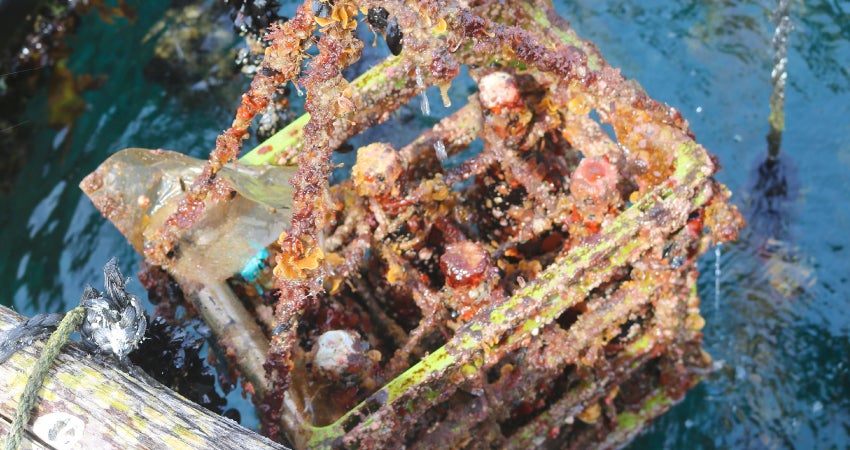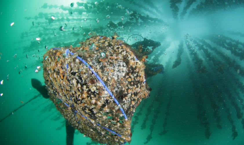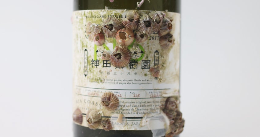 長い間、海で熟成されたワインは水揚げした際には海藻や貝などの雑モノがビッシリ付いており、海中熟成の様子を物語ってくれます。