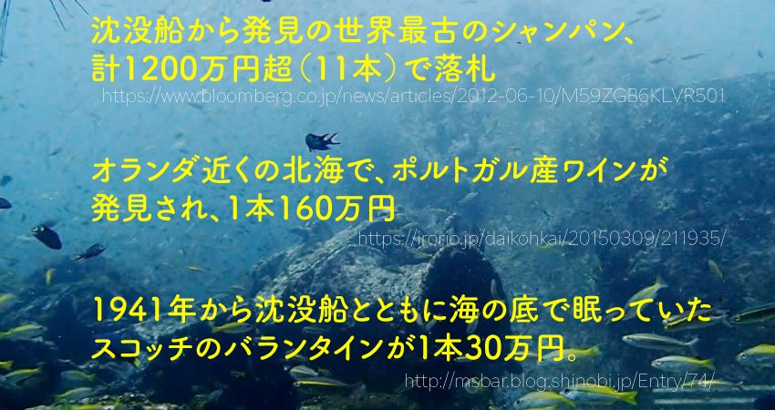 ワインやシャンパン、ウィスキーなど、安定した海水の深海に沈んだ沈没船から引き揚げられたワインが通常では考えられない価格で取引されたりしています。