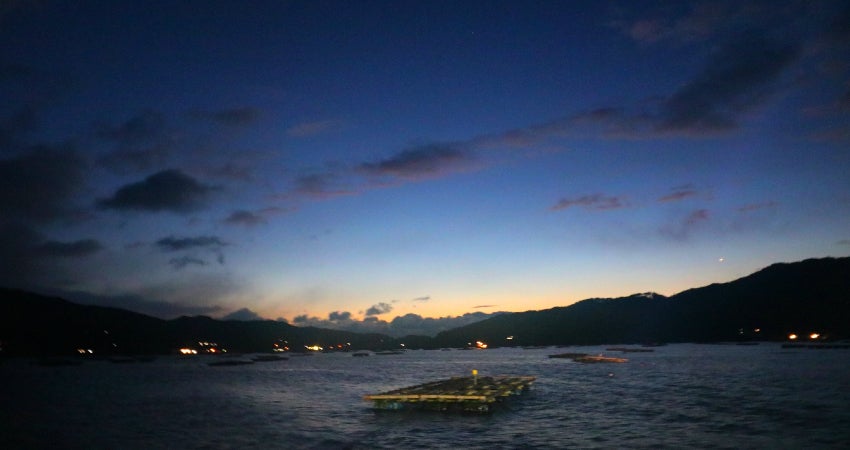 朝日が昇る広田湾の様子。大きな工場などがなく、きれいな漁場で極上の海産物が育ちます