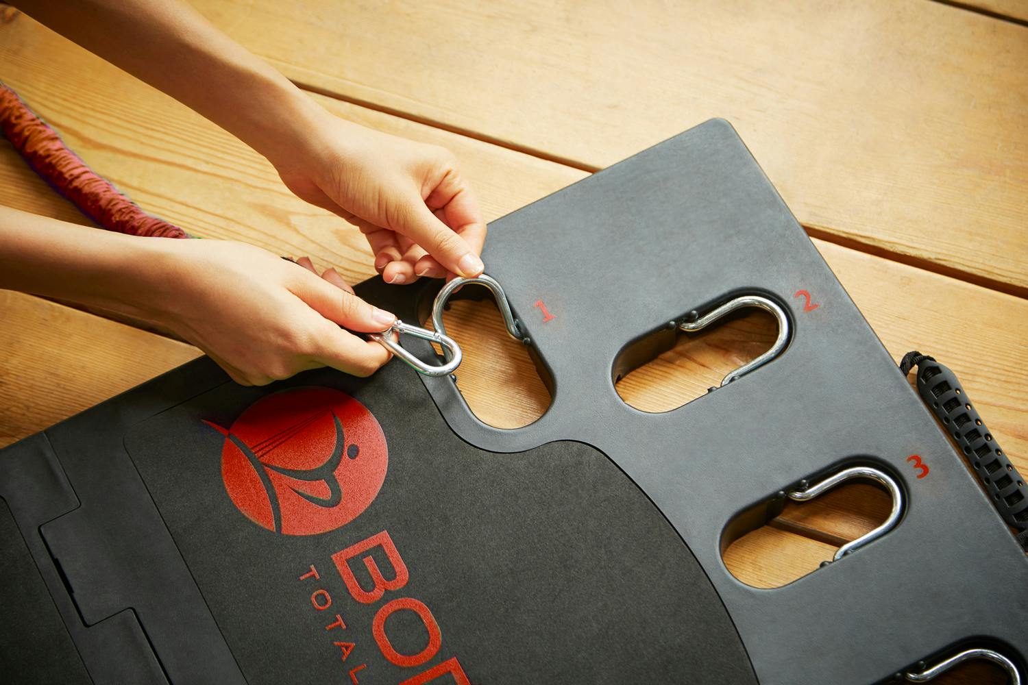 土台の1〜5番のアンカーいづれか2点に負荷バンドを通した後に、フックを別の番号に取り付けることで更に負荷を上げます。