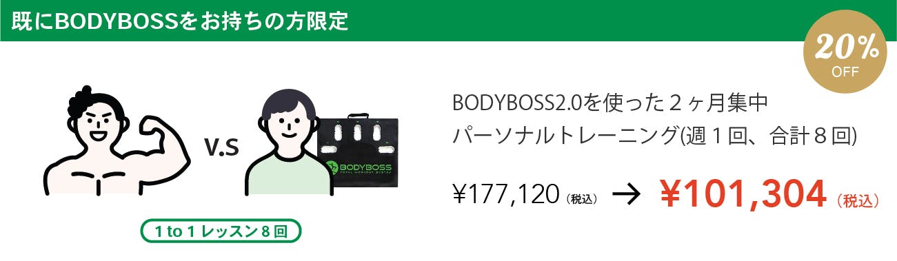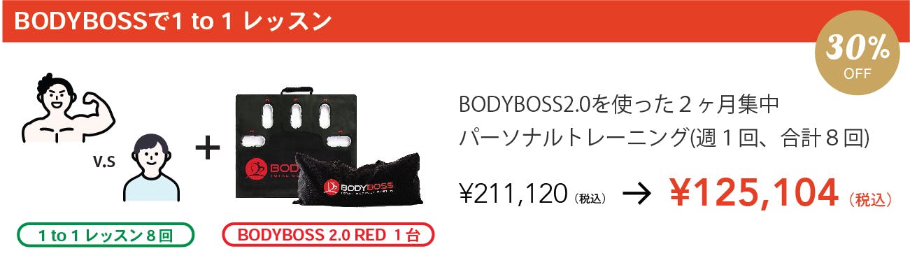 更に、BODYBOSSを使った貴方だけのワークアウトメニューをパーソナルトレーナーが2ヶ月間直接指導するプランもご用意しました。