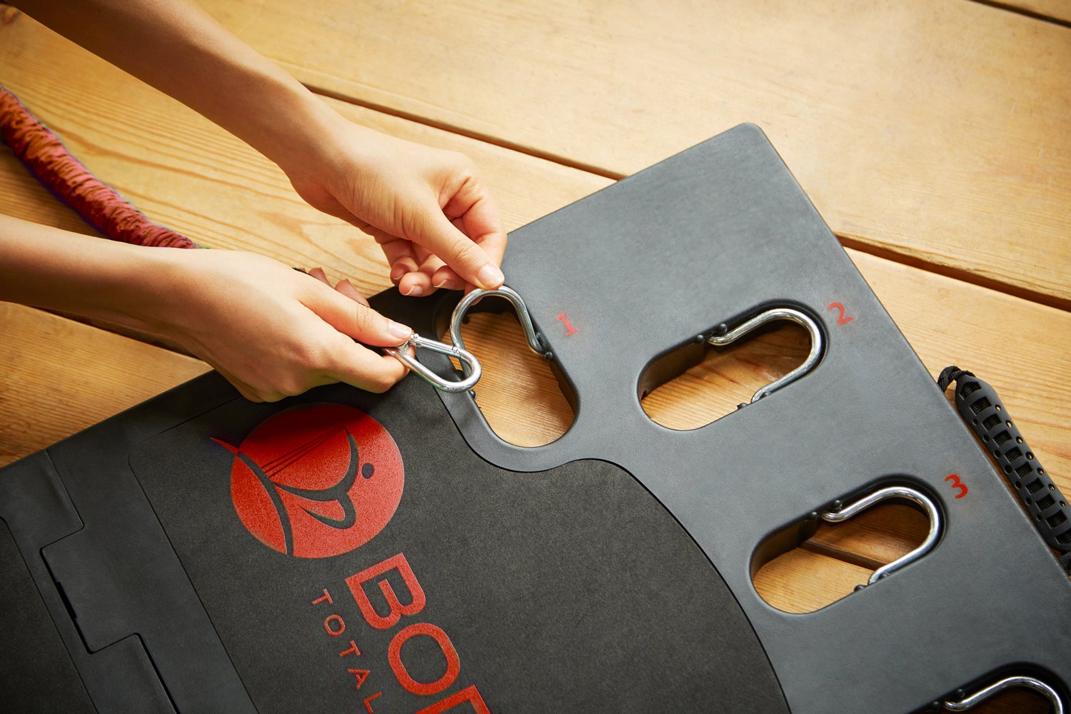 土台の1〜5番のアンカーいづれか2点に負荷バンドを通した後に、フックを別の番号に取り付けることで更に負荷を上げます。