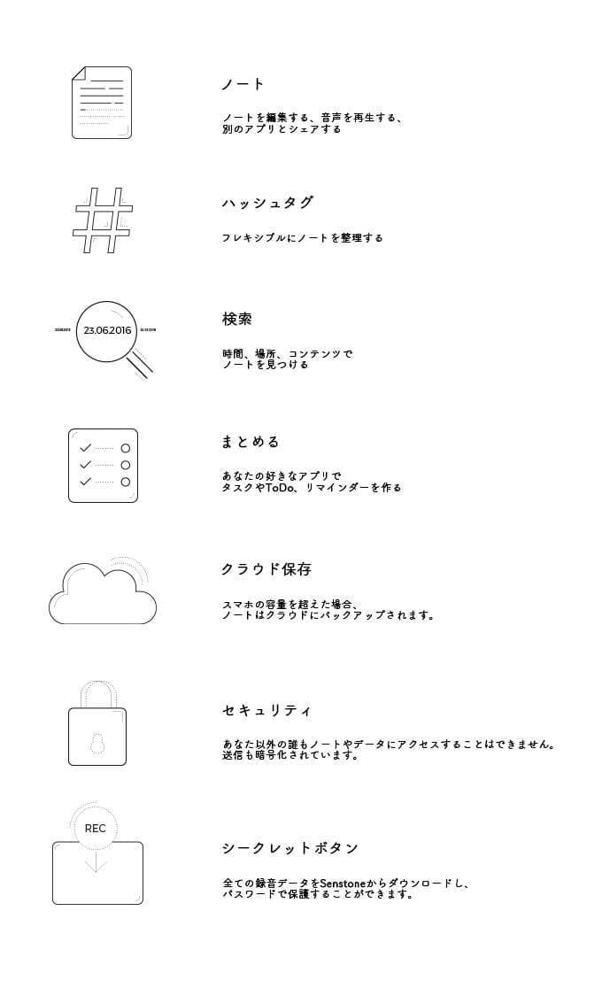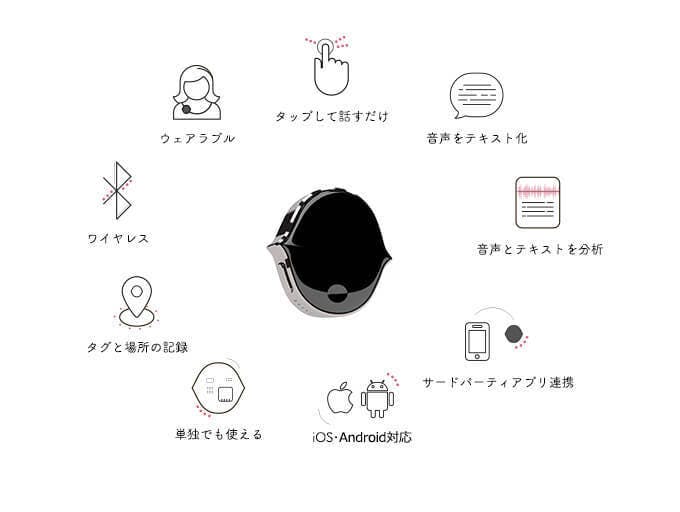 話すだけでノートを取ることができるSenstoneは、Senstone本体、専用スマートフォンアプリ、クラウドによって成り立っています。