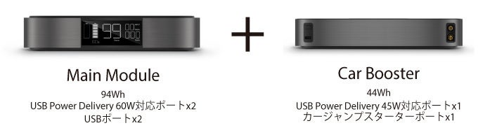 メインモジュールとカーブースターは専用マグネット端子(Pogoピン)により1つに合体することで充電容量の拡大とカーブースター機能を追加できます。このとき最大138Wh・ 37,600mAh @3.7Vもの容量が確保できます。