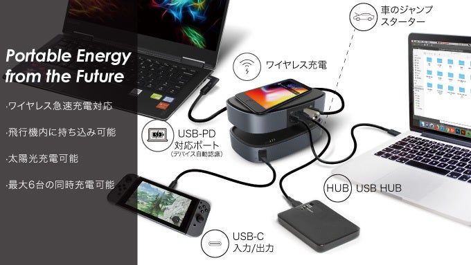 USB-CポートはそれぞれUSB PDに対応し、各ポート60Wの出力、同時使用で合計120Wの出力に対応。ノートPCなどの消費電力が大きいものでも充電することが可能です*。ビジネスの現場やアウトドアなどでも役立つエネルギーバンクとなります。