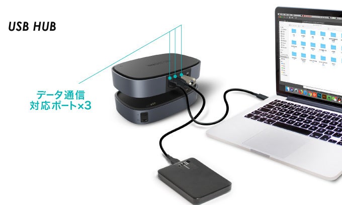 - USB-Aポートx2とUSB-Cポートx1はデータ転送(USB2.0)に対応
