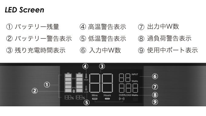 - スクリーンディスプレイ:充電器業界で最も大きな画面サイズを採用。バッテリー残量、バッテリー警告、残り充電時間、高温・低温警告、入力中W数、出力中W数、過負荷警告、使用中ポートを表示