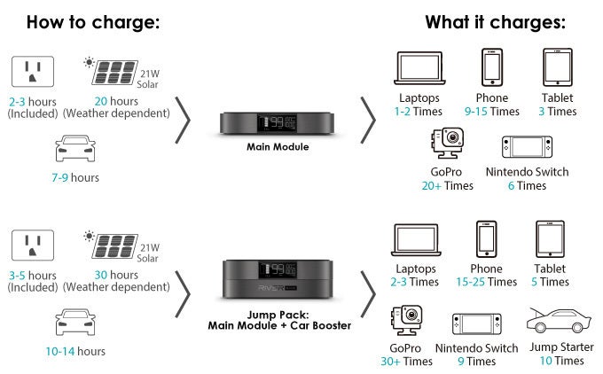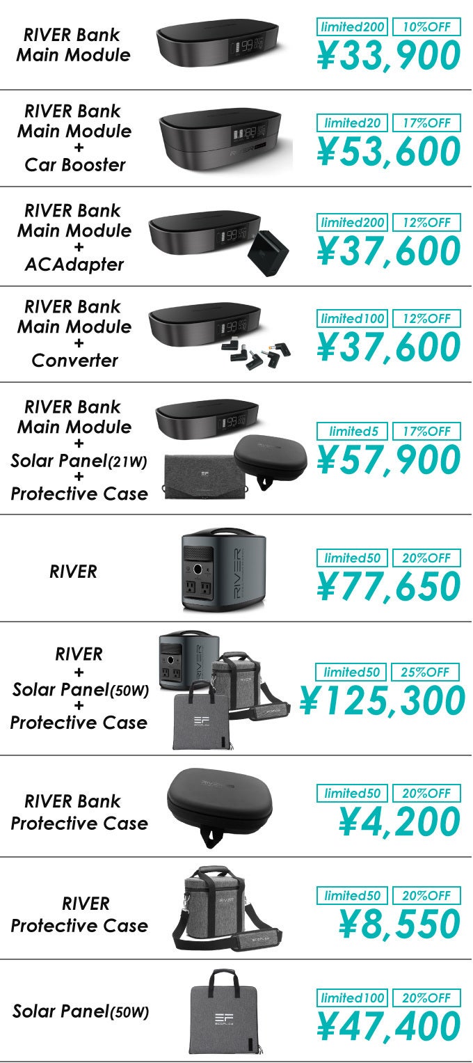 - RIVER Bank(メインモジュールのみ)を約20時間で充電(天候により変わります)