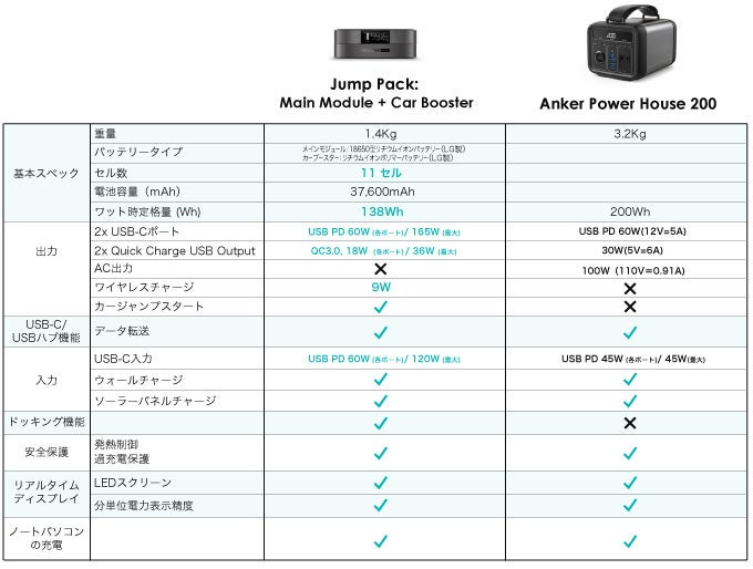 メインモジュールのみでも十分優れたバッテリー容量や機能を備えていますが、カーブースターと合体することで138Whもの大容量を実現。単純な非常電源としてだけでなく、自動車のバッテリー上がりにも対応できるジャンプスターター機能も付属するため、防災の観点からも有効な製品となります。