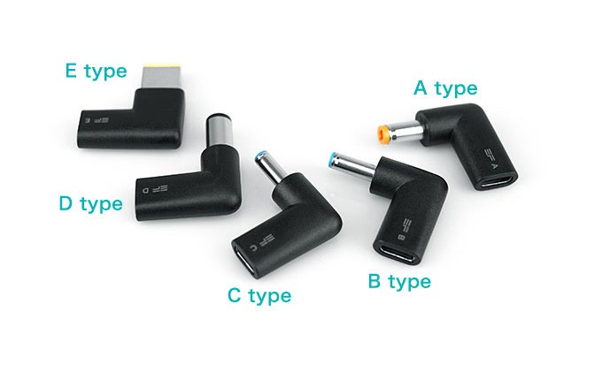 主にWindowsのノートPCで利用されている一般的なACアダプターに端子に対応するためのものです。USB-Cケーブルに装着することで給電が可能になります。上記5つセットでのご提供となります。