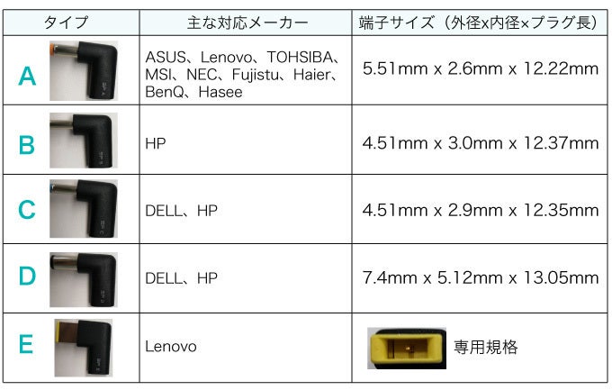 ※ 上記5タイプ以外のプラグが必要な場合、量販店などで販売されているDCプラグサイズ変換アダプタ等で利用可能な場合がありますが、メーカー指定品でないため動作の補償をすることができません。予めご了承くださいませ。