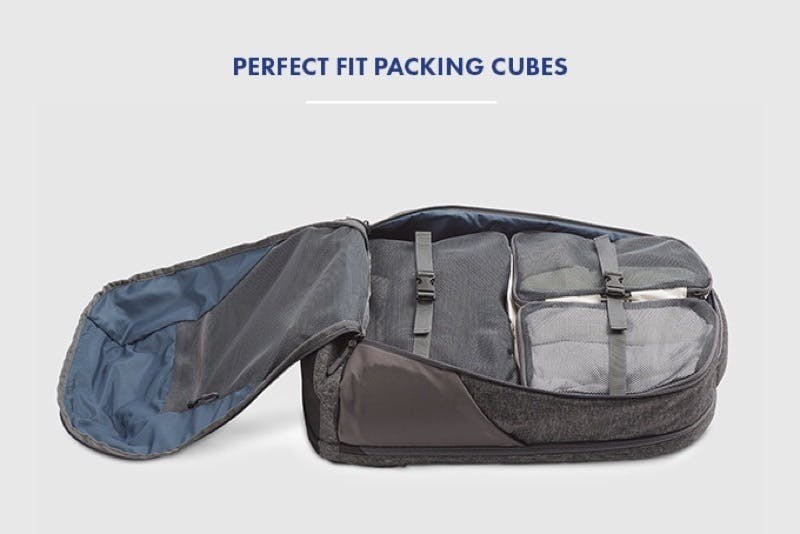 Akraは簡単かつ効率的にパッキングできます。バッグをフラットな状態で全開にできるので、荷物の整理が非常に楽です。また、Akraにぴったりと収納できるパッキングキューブも開発しました。衣類をきれいに圧縮して収納できます。フロントポケットは表裏両側からアクセス可能。セキュリティチェックでウオッシュバッグを取り出す際も、バッグの中身を見られずに済むということです。