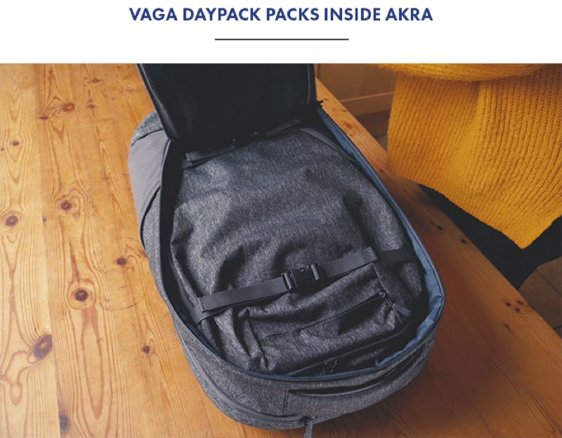 「Akra(アクラ)」は旅行中に必要な荷物にすぐに取り出せるようにデザインされた軽量トラベルバックパックです。「Vaga(ヴェガ)」はAkraの中にぴったりと収納できるデイパックです。
