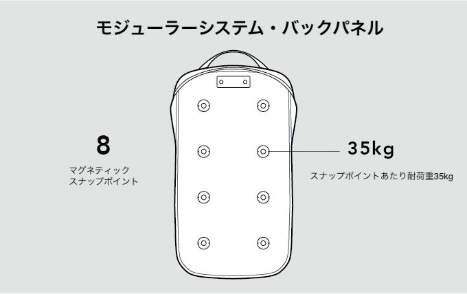 バックパネルには、モジュールを装着するための8つのマグネティックスナップポイントを搭載。スナップポイント1つあたりの耐荷重:35kg。