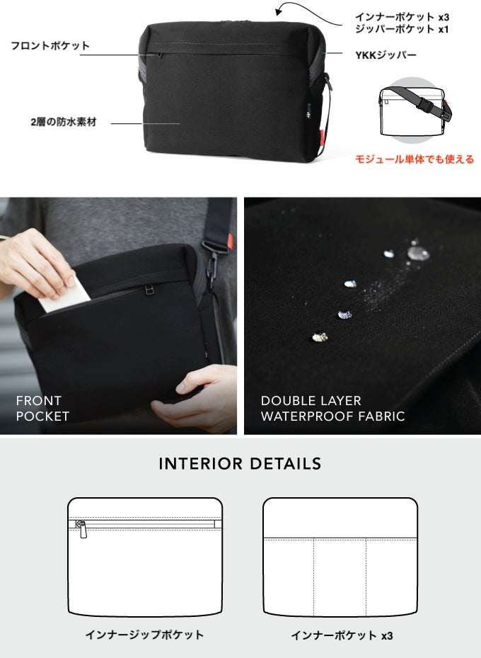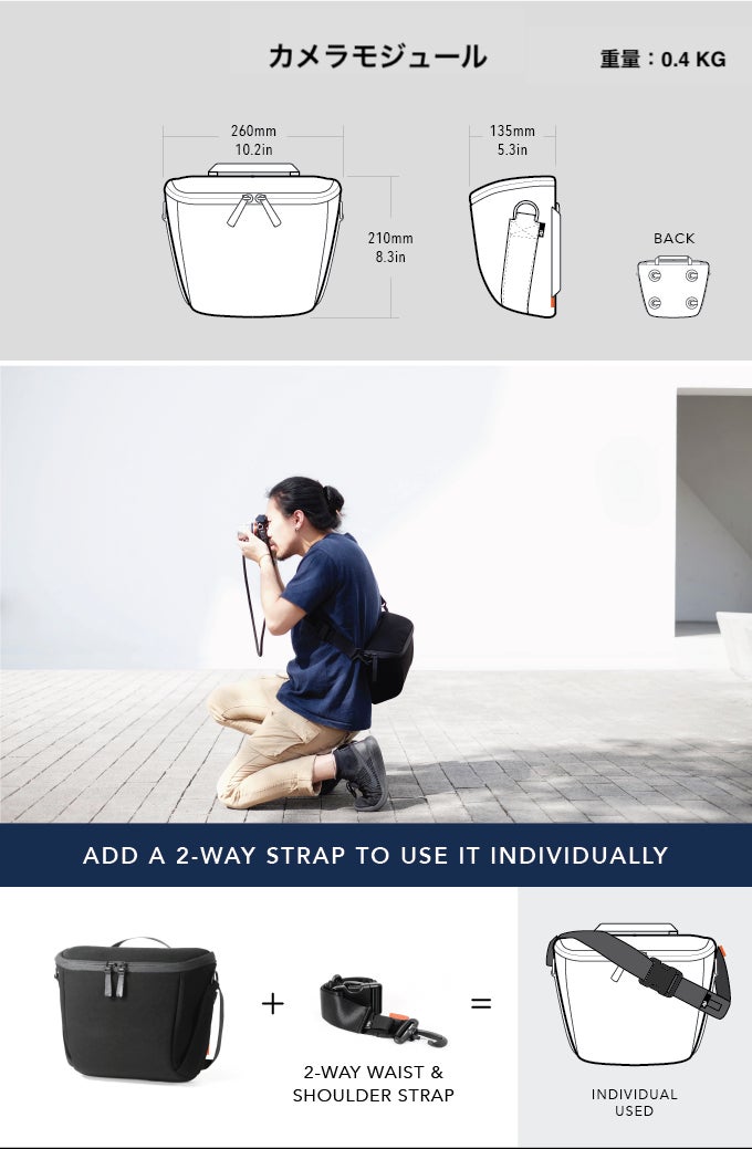 カメラ機材を安全に収納できて、取り外せばショルダーバッグにもなるように設計されたモジュールです。カバーはロールアップして開いたままにすることができ、機材をすばやく取り出すことができます。