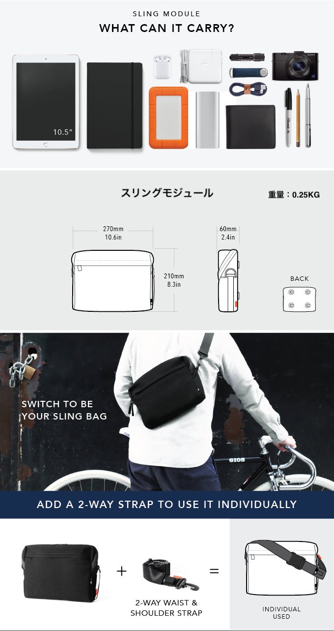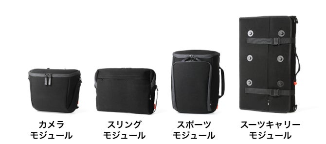 iPadや充電器など日常的なグッズを持ち運べるスリングモジュールと、カメラモジュールのセット。
