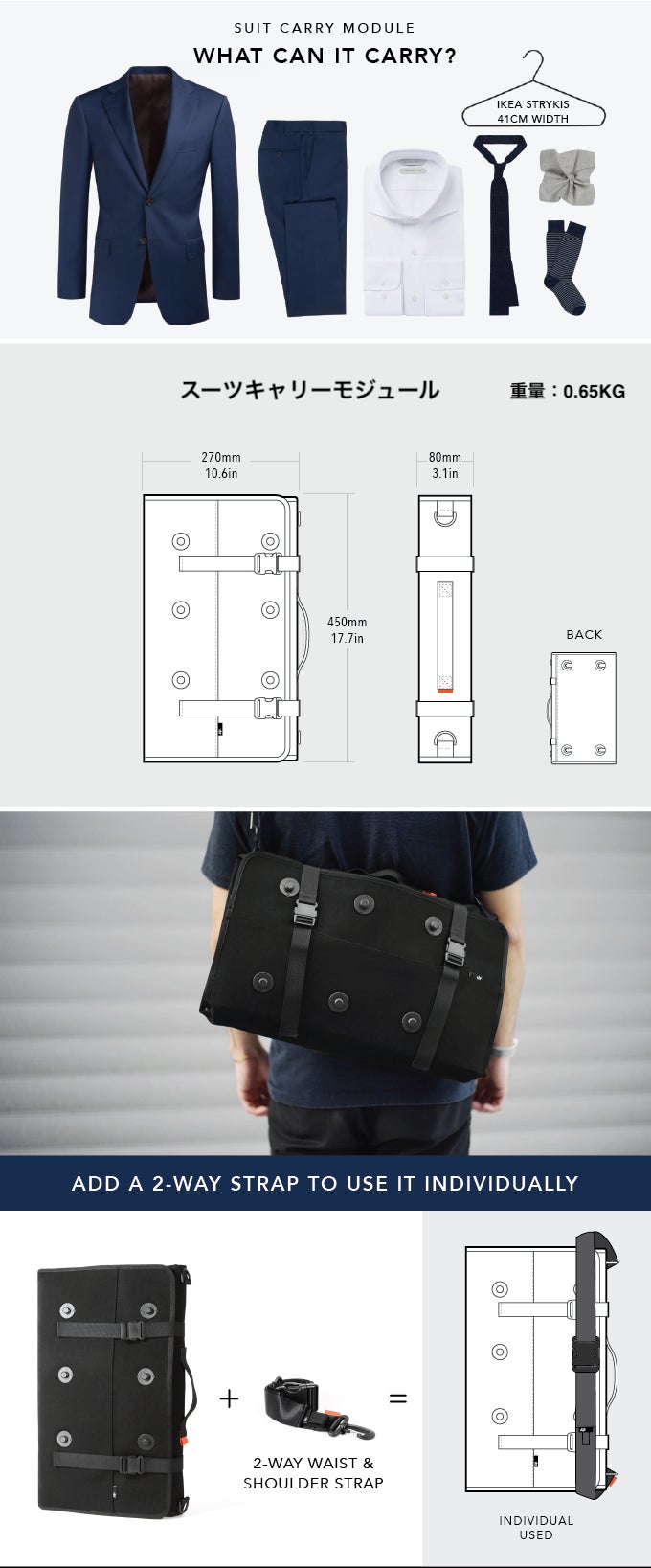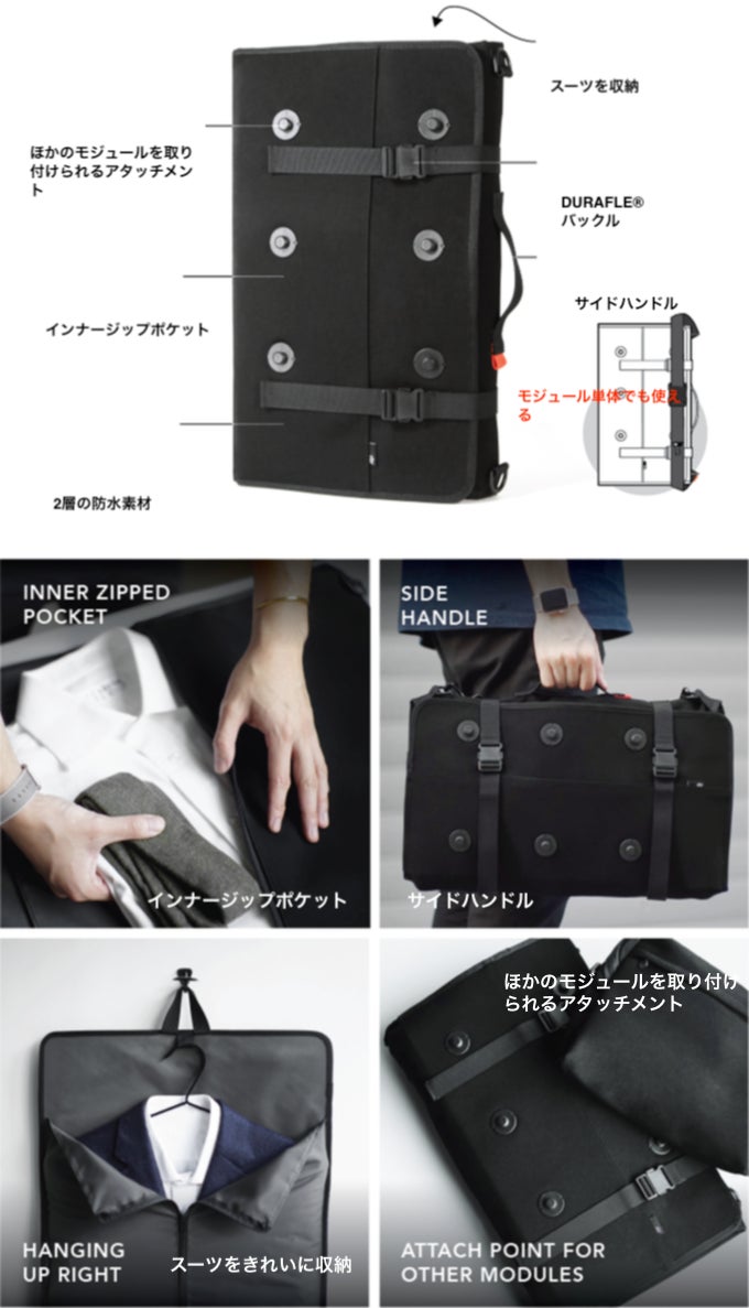 スーツをシワにならずに持ち運べるスーツキャリーモジュールと、iPadや充電器など日常的なグッズを持ち運べるスリングモジュールのセットです。