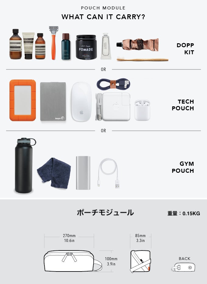 ポーチモジュールは、ウォーターボトルやジムの必需品を持ち運んだり、旅行のポーチとして使用することができます。