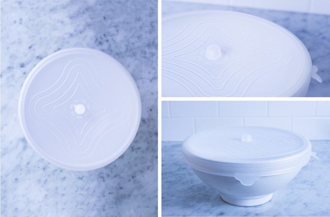 「UniLid」の両側についている取っ手を持って引っ張ると器にぴったりフィットして密封できます。