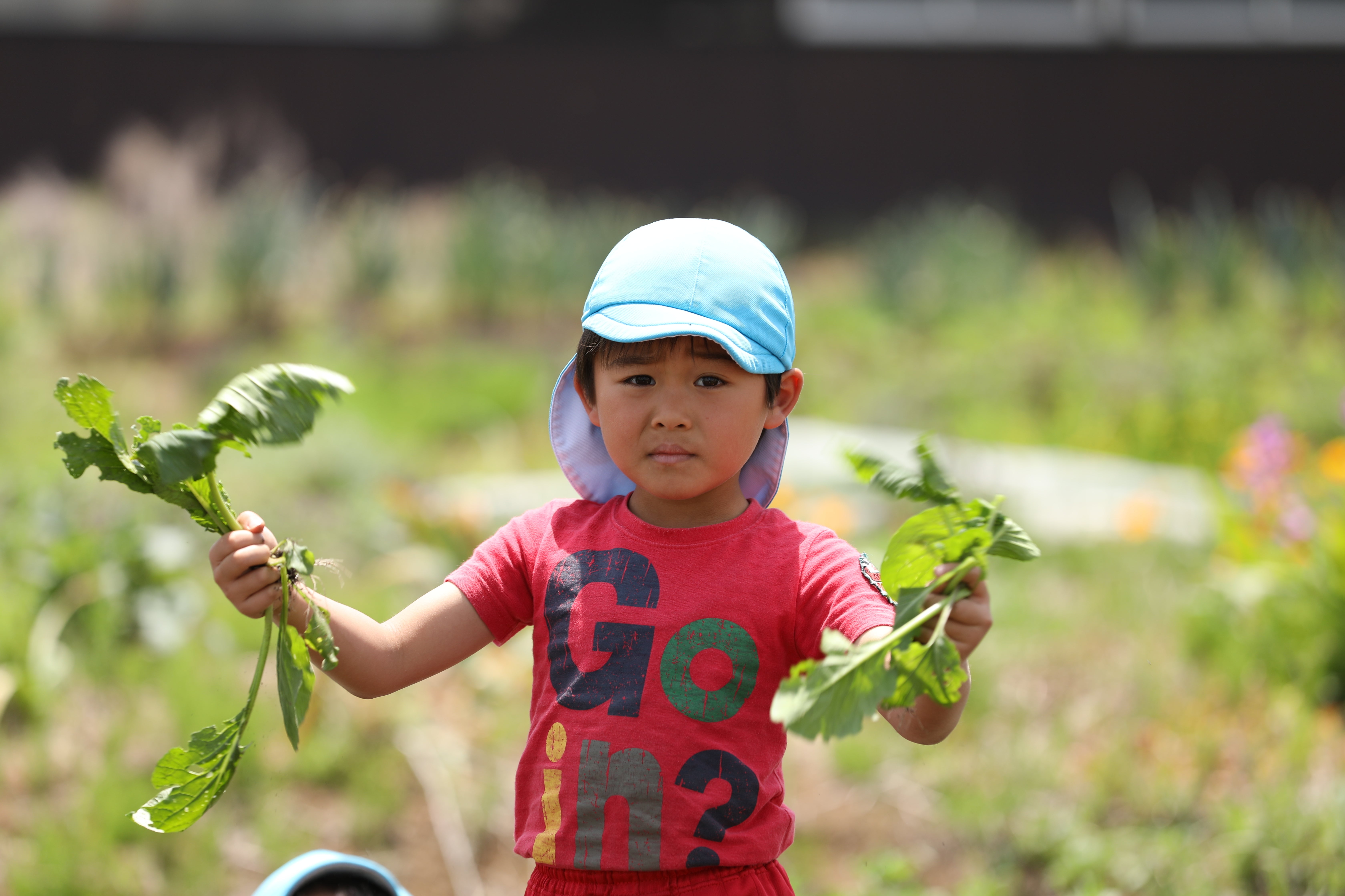 ▲地域のボランティアの方々と、園内の畑で一緒に育てた野菜を収穫しました。