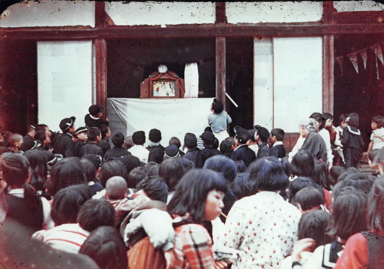 ▲寺子屋に様々な年齢のこどもたちが集まって紙芝居を見ている様子