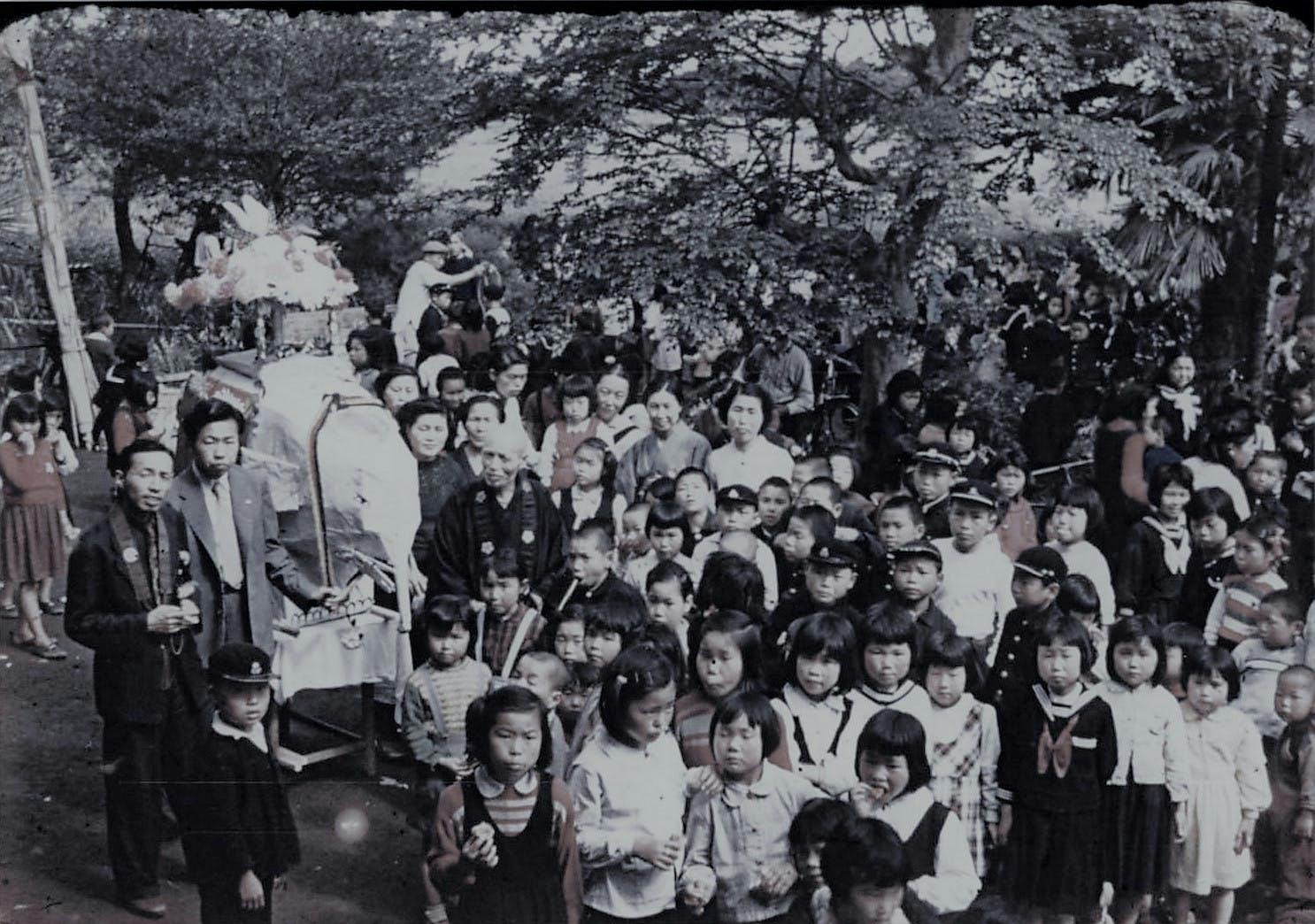 ▲地域のこどもたちがお寺に集まり花まつりをしている様子