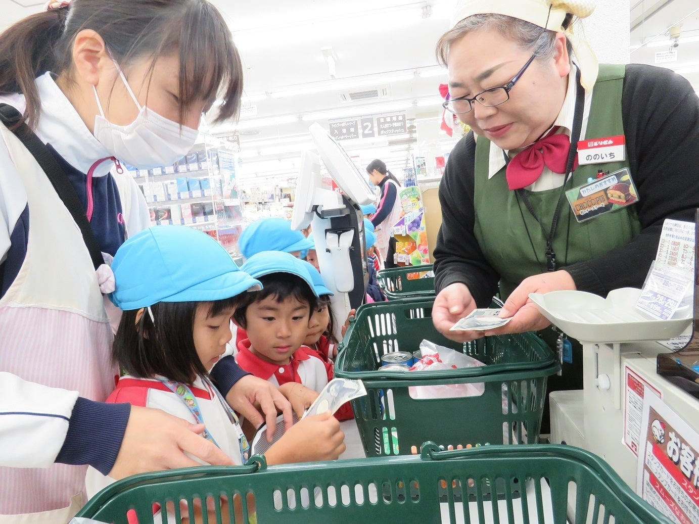 ▲地元のスーパーへ園児たちとお買い物へ。支払い、お店の方とのやりとりすべてこどもたちが行い、それを見守ってくださる地域の方