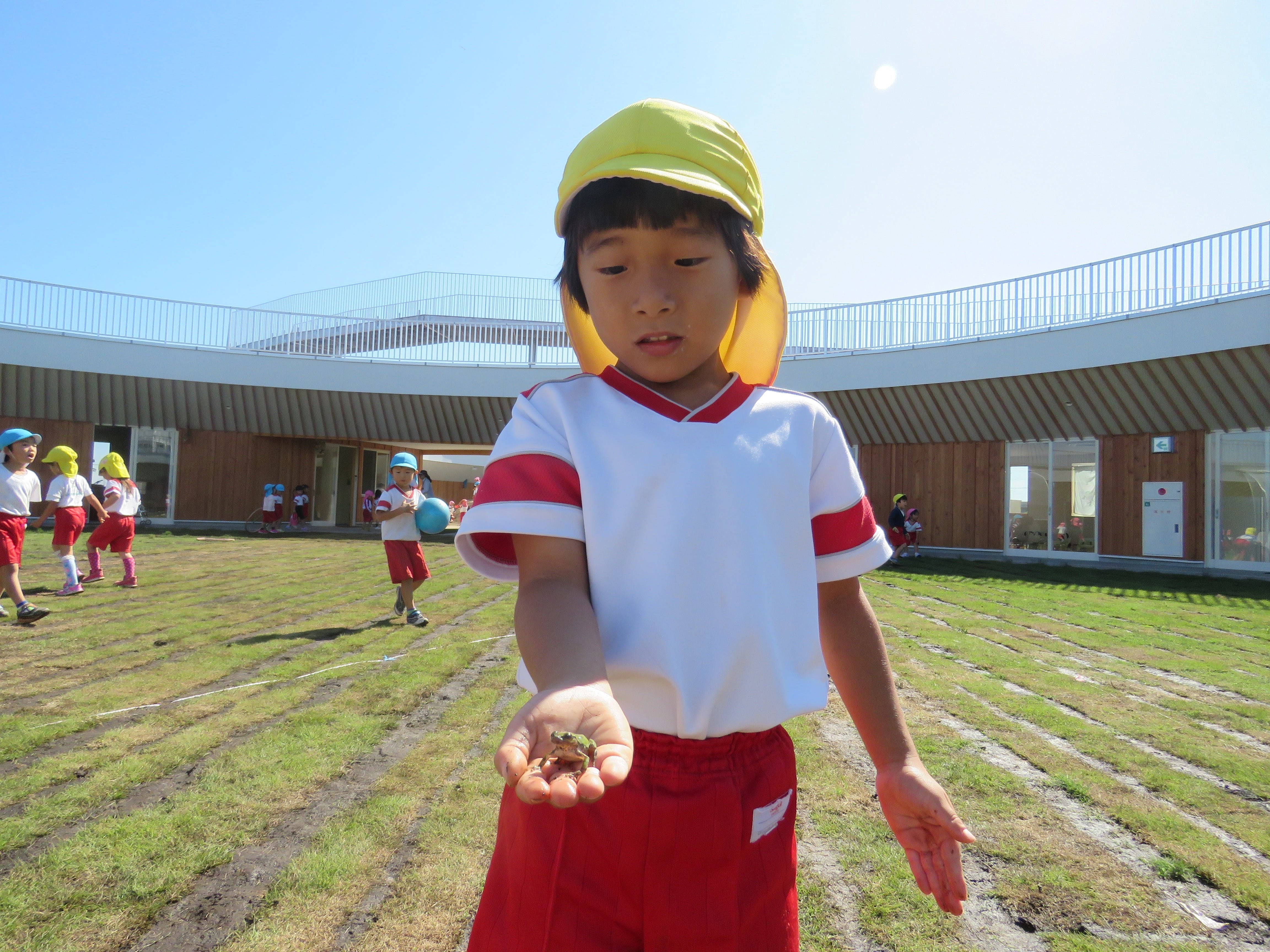 ▲園庭でカエルを見つけ、見せに来てくれたこども。生き物に興味津々の様子でした。