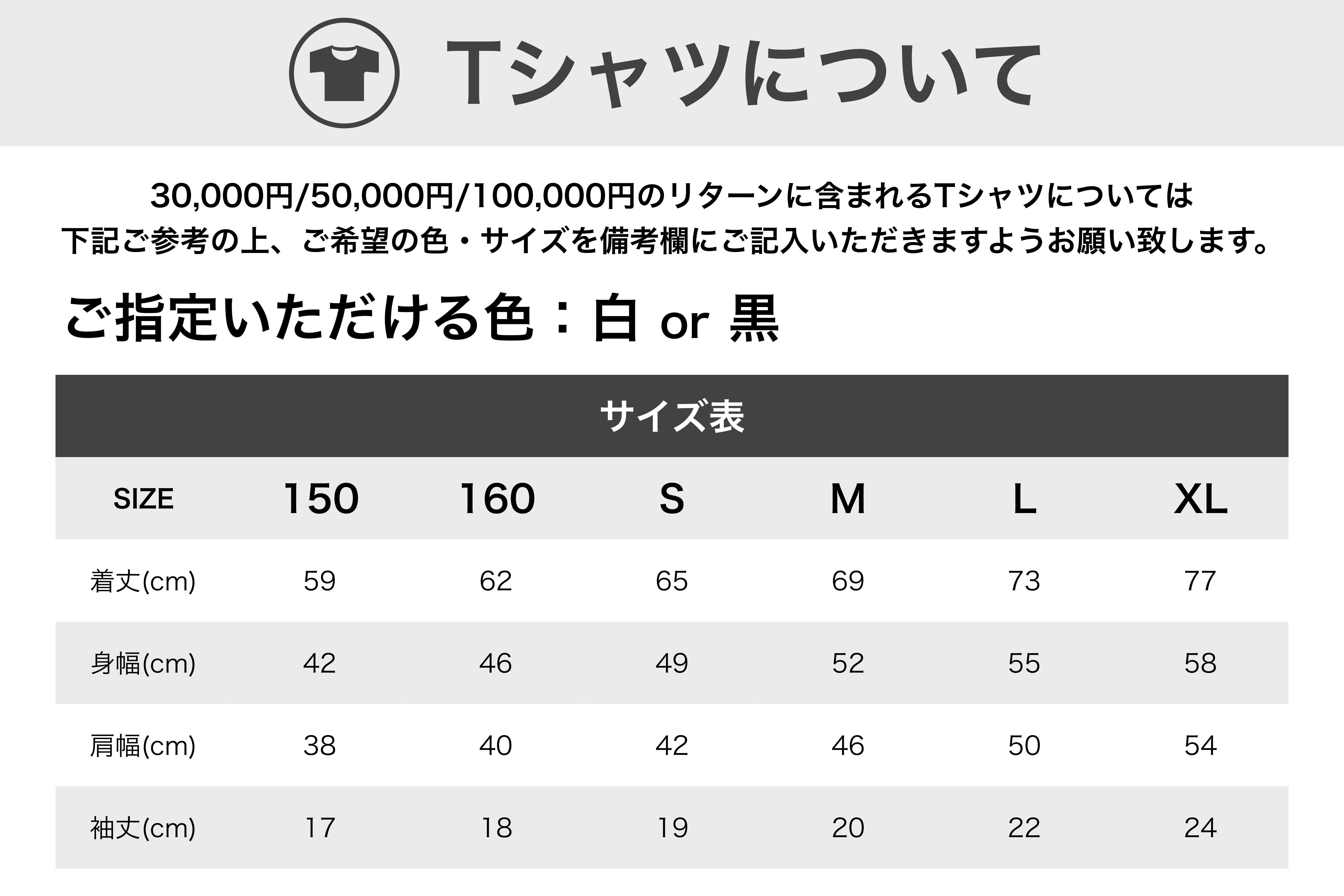 ※以下は30,000円/50,000円/100,000円コースのTシャツに関するご案内となります。