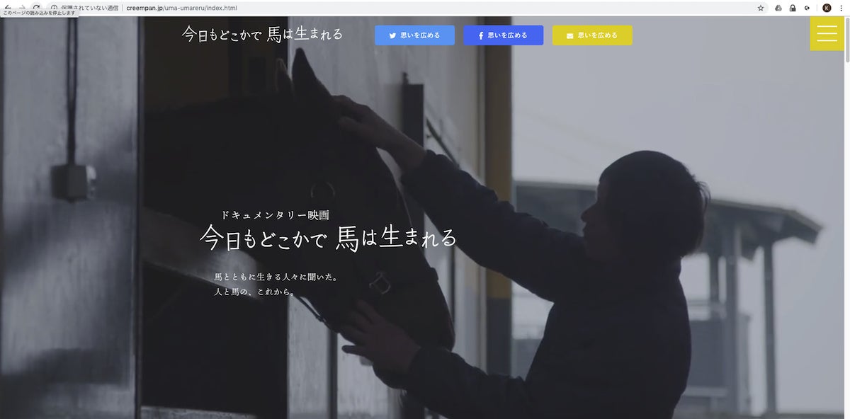 いつもお世話になっております。Creem Panの平林です。今回のクラウドファンディングの公約の一つでもありました、映画『今日もどこかで馬は生まれる』公式サイトがオープンとなりました!映画の内容はもちろん、当プロジェクトの今日までの歩み、その他これまでの活動でCreem Panに寄せられたご質問などを、サイト作りには反映させていただいております。そして何より注力したのは「思いを集める」こと。Twitter上に書き込みから、これまで行った上映会やイベントでお配りしたアンケートに書いていただいた、映画の感想まで、現状Creem Panが把握しているものは全て、当サイトの「Review ~思いを集める。~」ページに集約させていただきました。まだまだこれからも、もっともっと思いを集めていく所存です!また、これまでCAMPFIREを通じて行っておりました「活動報告」ですが、今後は特設サイト上「 Information」にて行いますので、ご承知おきのほど、宜しくお願いいたします。そして映画特設サイトオープンに合わせて、Creem Pan Official Online SHOPも開設いたしました!こちらでは、映画パンフレットや卓上カレンダーなども販売しております!売り上げは引退馬支援のムーヴメント創出に向けた、Creem Panの活動資金にさせていただきますので、よろしければ、合わせてご覧ください。* * *最後になりますが、314名の支援者の方々、ウェブ制作に従事してくださったリタワークスのみなさま、ディレクターの荒木様、本当にありがとうございました!これからもWebサイトを起点に、引退馬支援のムーヴメント創出へ向けて、活動を加速して参りますので、どうか変わらぬご愛顧のほど、宜しくお願いいたします。Creem Pan 平林