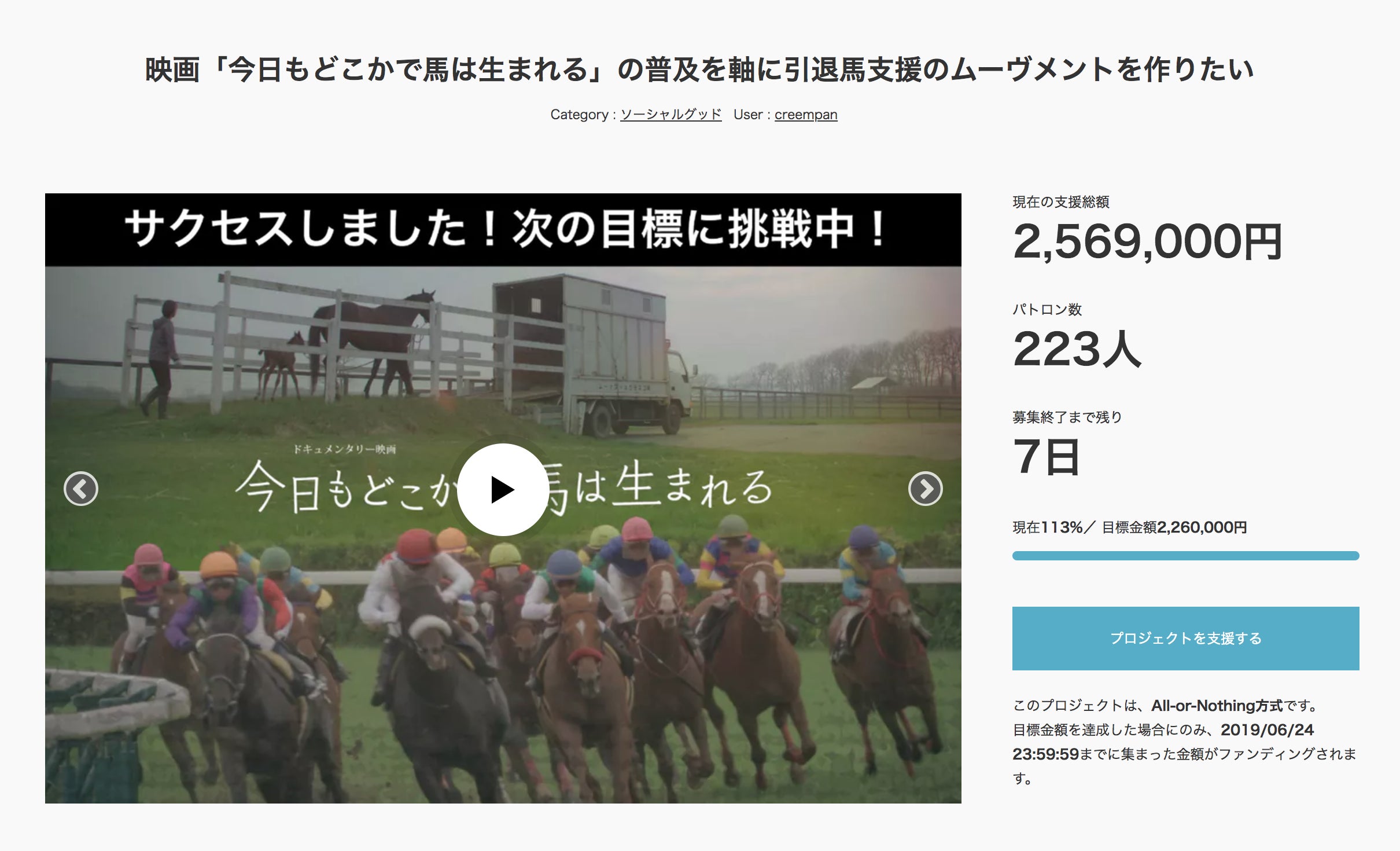 現在、クラウドファンディング開始から32日目で223人の方々から 2,569,000円の