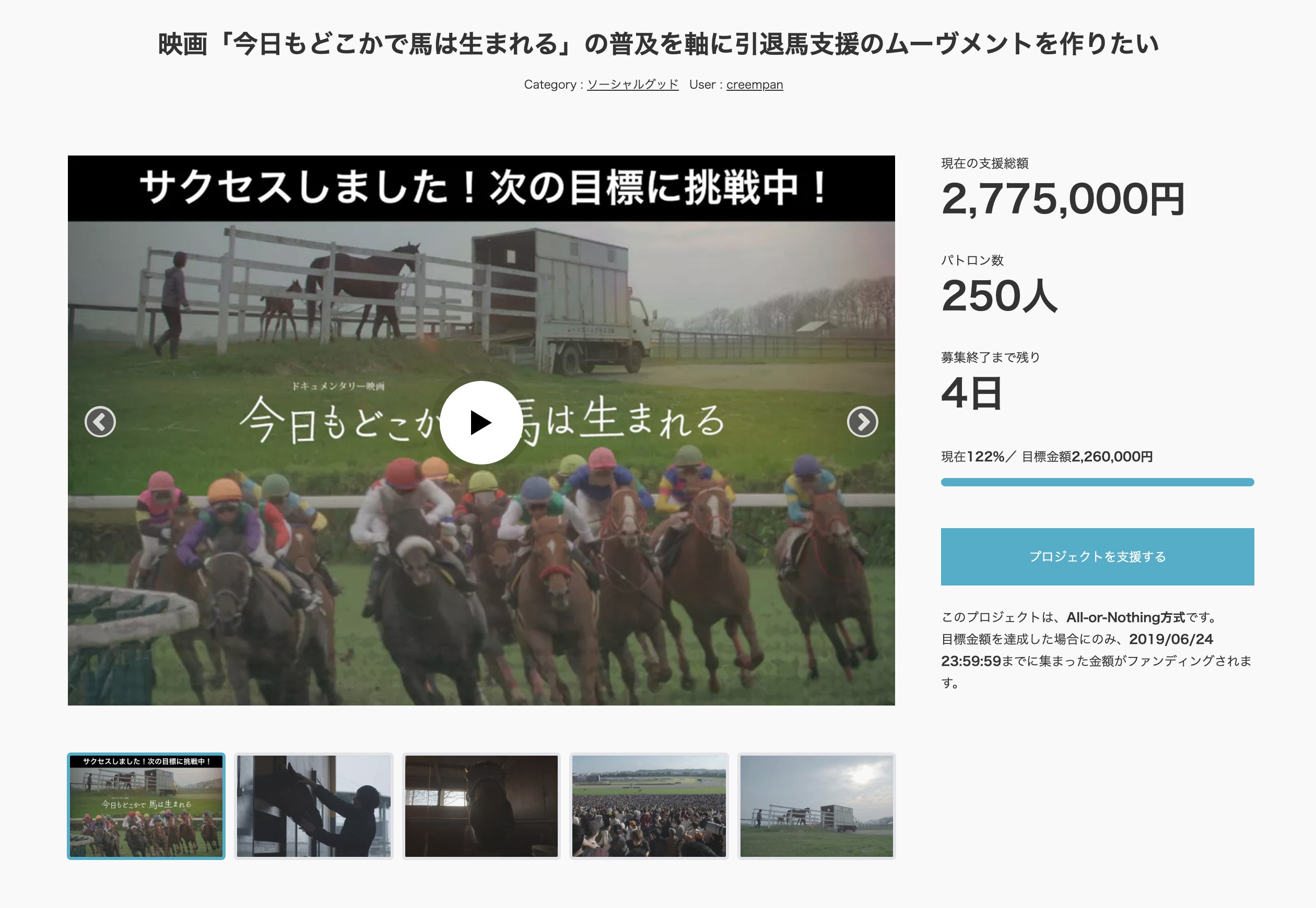 現在、クラウドファンディング開始から36日目で250人の方々から 2,775,000円の