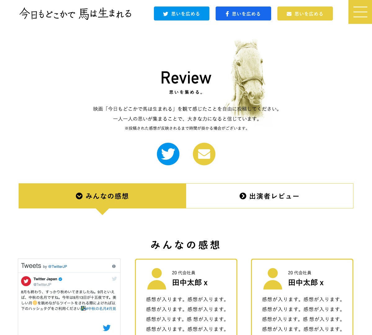 文章書き起こしのボランティア募集のお知らせいつも大変お世話になっております。Creem Panの平林です。現在、映画『今日もどこかで馬は生まれる』特設サイト上の、「Review〜みんなの感想〜」という、SNS / メール / イベント時に配布したアンケート用紙 から集めた「映画の感想」を集約するページを制作しております。そうした中で、アンケート用紙上の手書きの感想文をデジタル化しなければならず、大変恐縮ながら「文章書き起こし」のボランティア様を募集させていただきます。▼依頼内容紙のアンケート用紙に書かれた、年齢/性別/イベント名/感想を、指定のフォームorシートに記入していただく。(Googleフォームかスプレッドシートになります)▼備考・文字数は人によって様々だが平均して100字ほど・用紙は全てで150枚ほどで応募人数から計算して枚数を割り振る・原則、個人情報が書かれていない用紙のみを依頼します・応募状況により予告なく応募を締め切る場合がございます▼スケジュール①応募開始:9/19(木)②応募〆切:9/21(土)13:00※その後速やかに割り振りを行い、ご連絡いたします。③アンケート用紙お渡し(手渡しかご郵送 ※個別やり取りで決定)④実作業⑤作業〆切:9/29(日)13:00▼応募方法下記いずれかの方法でご連絡ください。①TwitterDM|https://twitter.com/creempan2017②Mail|creempan2017@gmail.com③LINE|http://nav.cx/a8nUjojまたその際に、下記情報を明記していただけますようお願いいたします。・氏名・ご住所・その他備考(お手伝いの条件などある方)※お預かりした個人情報は当件以外には使用いたしません。以上となります。いつもお願いばかりで申し訳ございません。皆様からのご応募をお待ちしております。Creem Pan代表 平林健一