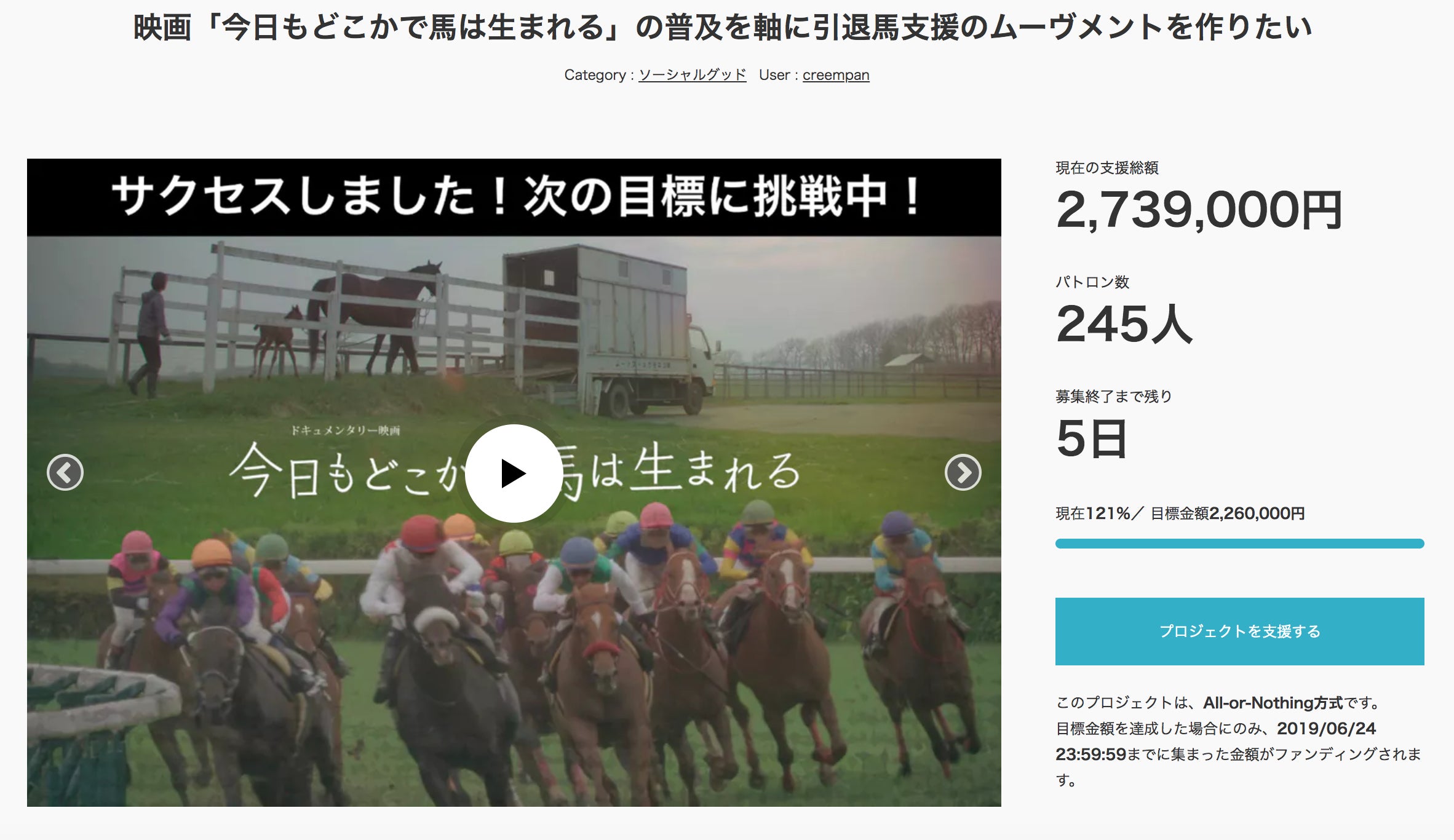 本日は6名の方々に44,000円のご支援をいただきました。現在、クラウドファンディング開始から35日目で237人の方々から 2,739,000円のご支援をいただいており、残り、5日で261,000円で第二目標が達成となります。ストレッチゴールに向けて挑戦中です!▽ストレッチゴール公約映画特設サイトの品質向上と、引退馬支援における重要情報の調査とアーカイブ化https://camp-fire.jp/projects/139817/activities/85843こちらの重要情報のアーカイブ化ですが、決定した背景には映画制作での経験があります。映画の中でもいくつか引退馬に関する数字の情報を伝えるシーンがいくつもあります。数値化することで、より引退馬が置かれている状況が具体的に伝わるという意味でとても重要なシーンでありました。しかし、これらの情報を調べる中で、引退馬に関するデータというものを探し出すことが難しいという現実に直面しました。また、見つかったとしても、出典先が不明確だったり、誤ったデータも存在することも問題であると感じました。◇ ◇ ◇座談会を開催するうえで、議論を行ううえで、引退馬が置かれている知っておかなければならない情報の収集。これらをリサーチすることは簡単なことではないと思っております。出典先も明確にしたいと考えておりますので、許可取りも困難を極めることが予想されます。それでもこれを実行することが、引退馬支援の課題を一歩進める為に必要だと考え、このような目標を掲げることになりました。是非、応援の程よろしくお願い申し上げます。平本