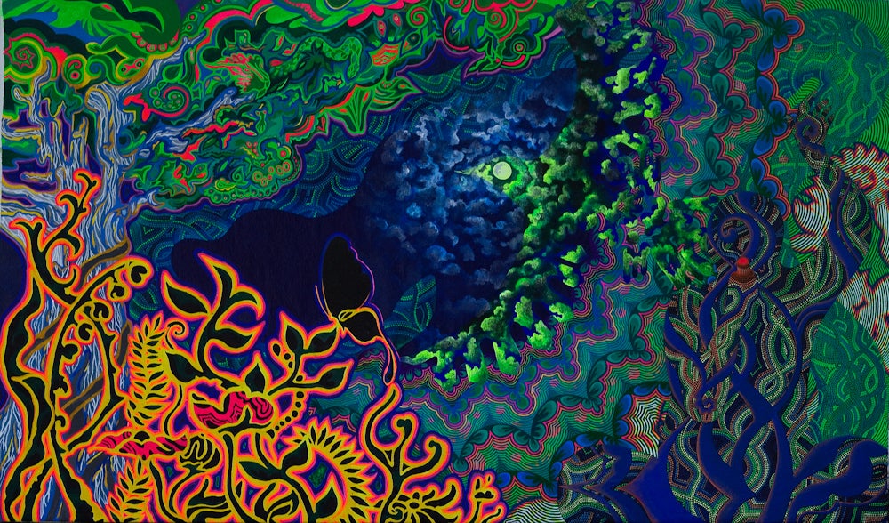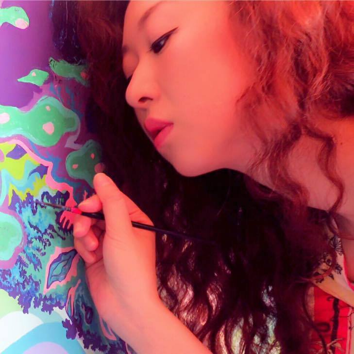 その時の体験を元に見えないけれど確かにそこにある世界の制作を続けている。独特の曲線と色使いを特徴とした作風で鮮やかに目に見えない世界に感じる色と形を表現し、これまでに展示会や飲食店の壁画を手掛け現在も制作活動中。