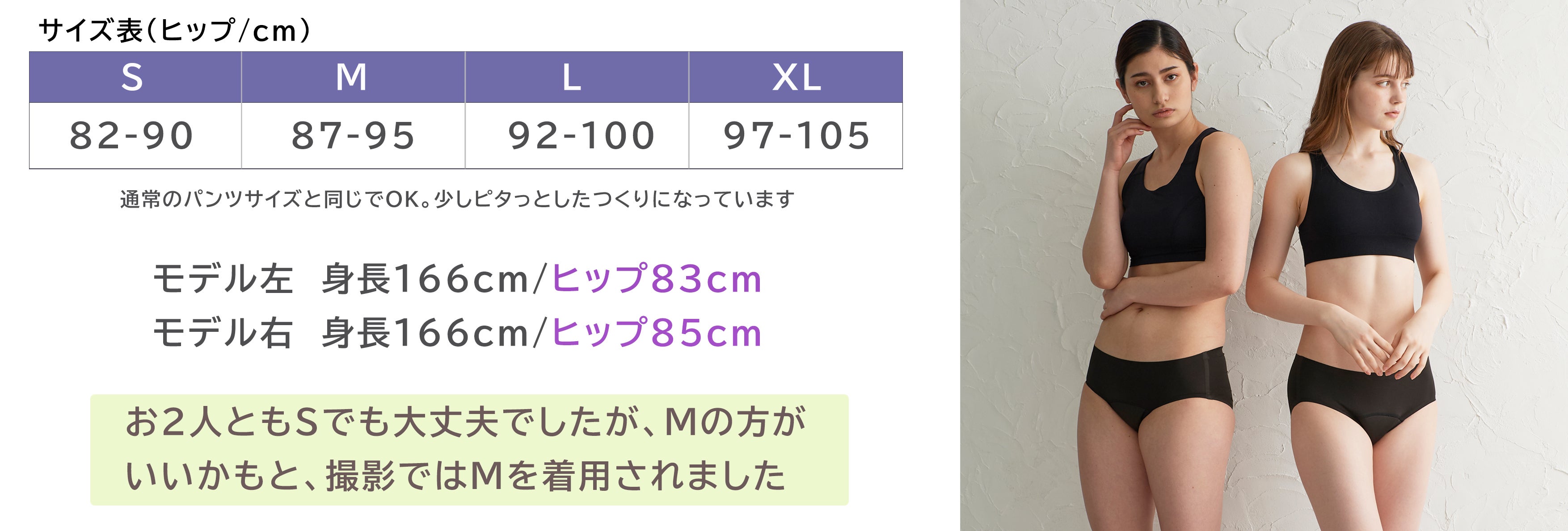 参考:ヒップ84cmの方でも、身長が150cm台の方はS、160cm台の方はMでした