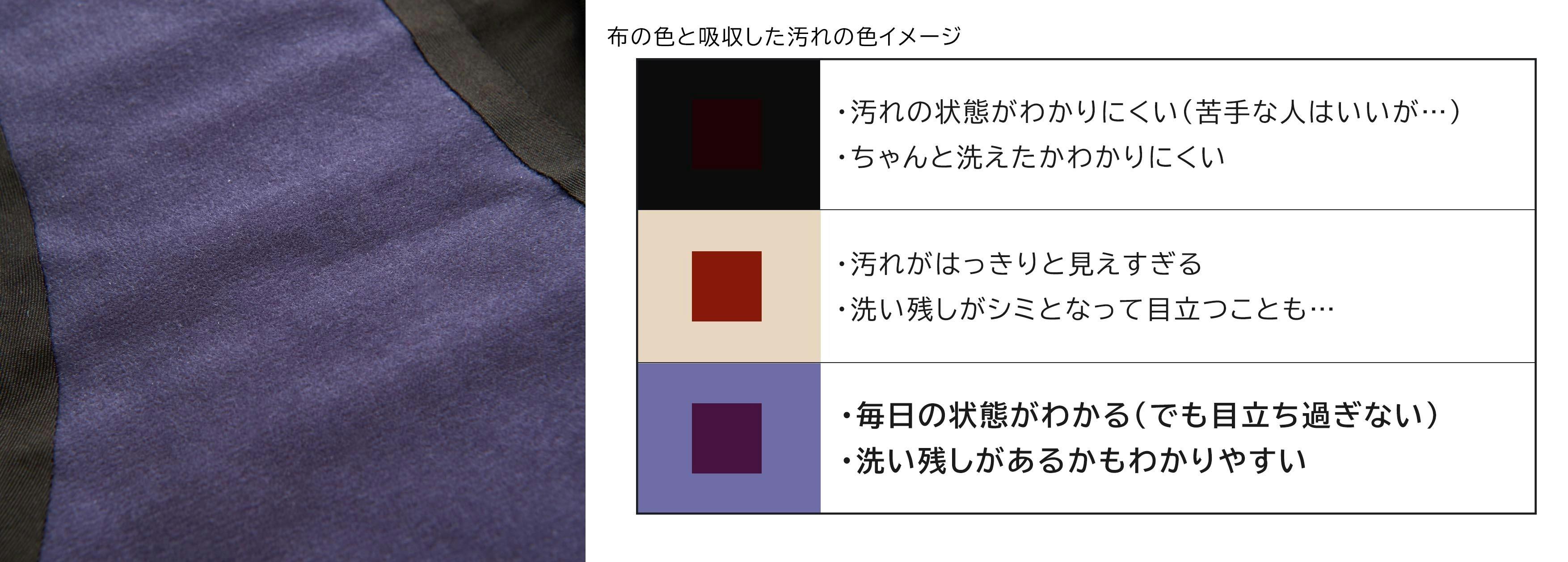 自分の体から出たものをあまり見たくない、という人には黒色がいいのですが、量などで自分の健康状態を見るアスリートにとっては布が黒色だと判断できない…。でも薄い色の生地だと生々しい…。