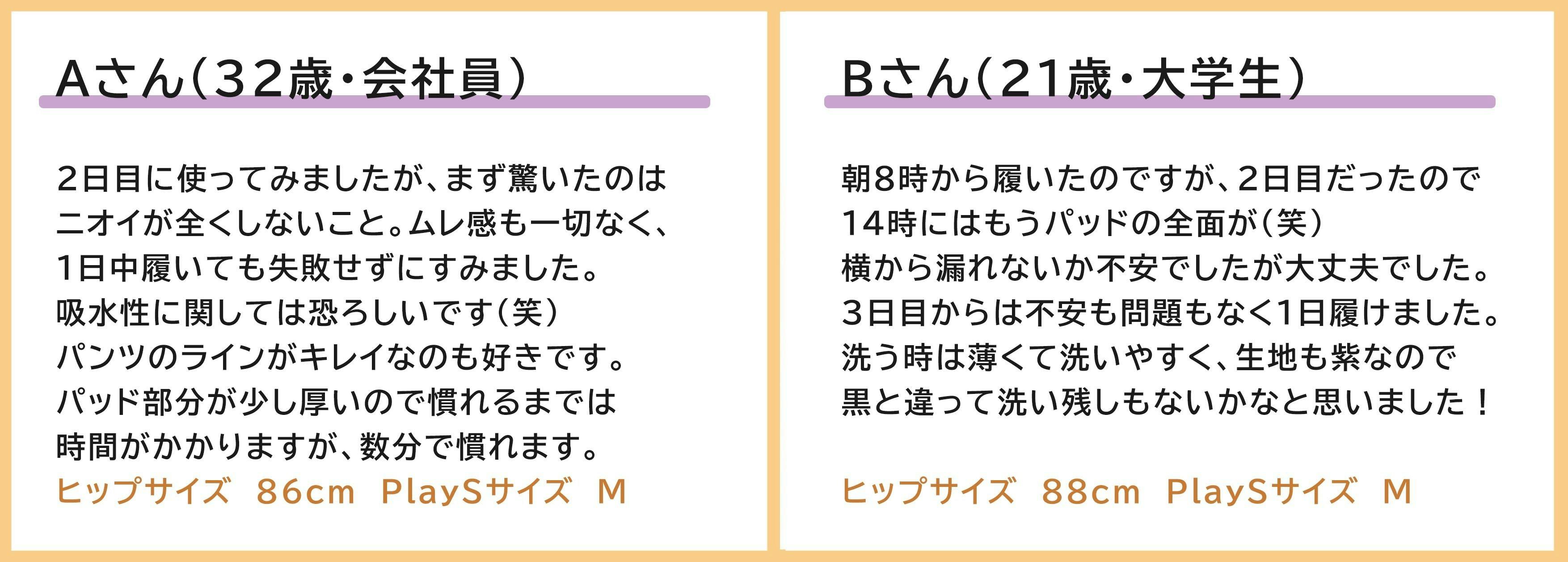 においが気にならないことにまず驚きました。トレーニング時に一切の不快感が無く、快適に過ごすことができました。もちろん洗濯後もにおいが全く残っていません。洗う時も余計な手間がかからないので、すごく機能的です。ナプキン着用時に起きがちな、かゆみやムレも気にならないので、本当に気に入っています。