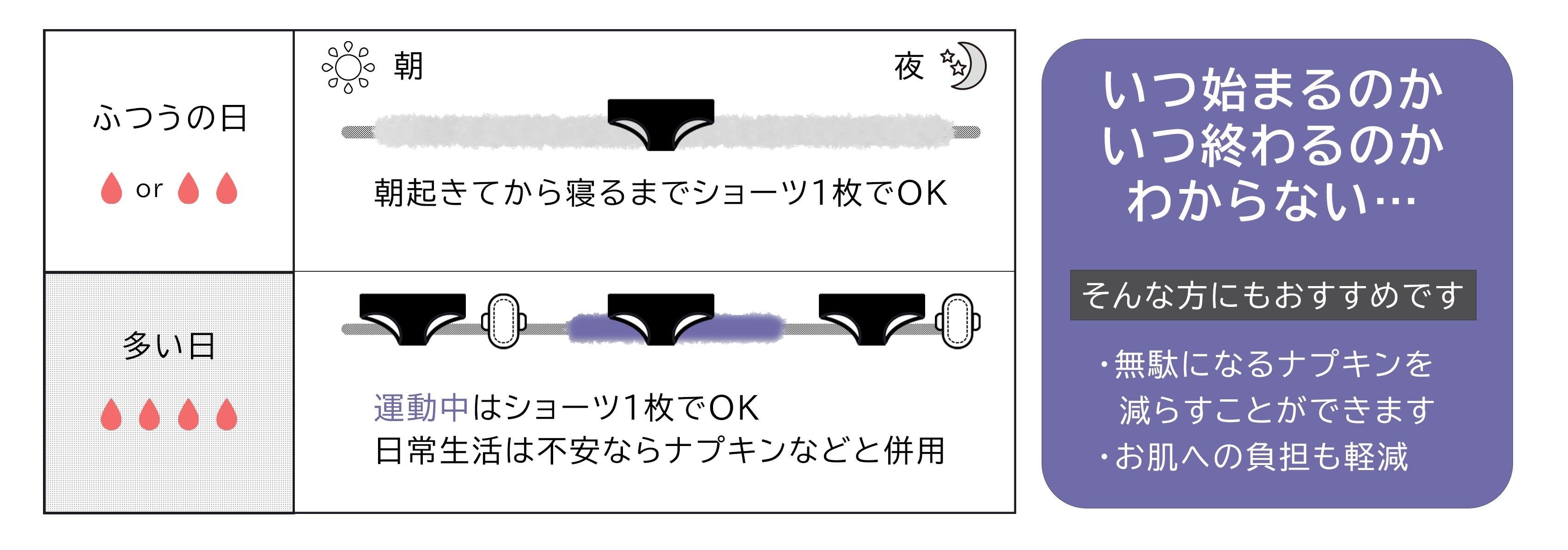 不安な方や、多い日はナプキンなどと併用するとさらに安心です。