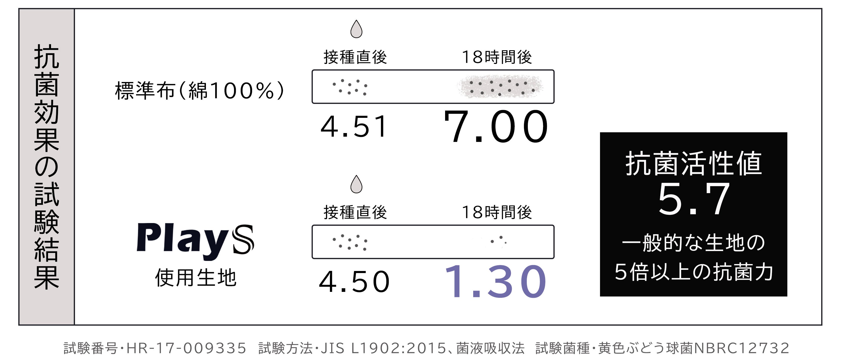 「PlayS」に使用している生地は一般的な綿の生地とくらべて抗菌力が5倍以上です。