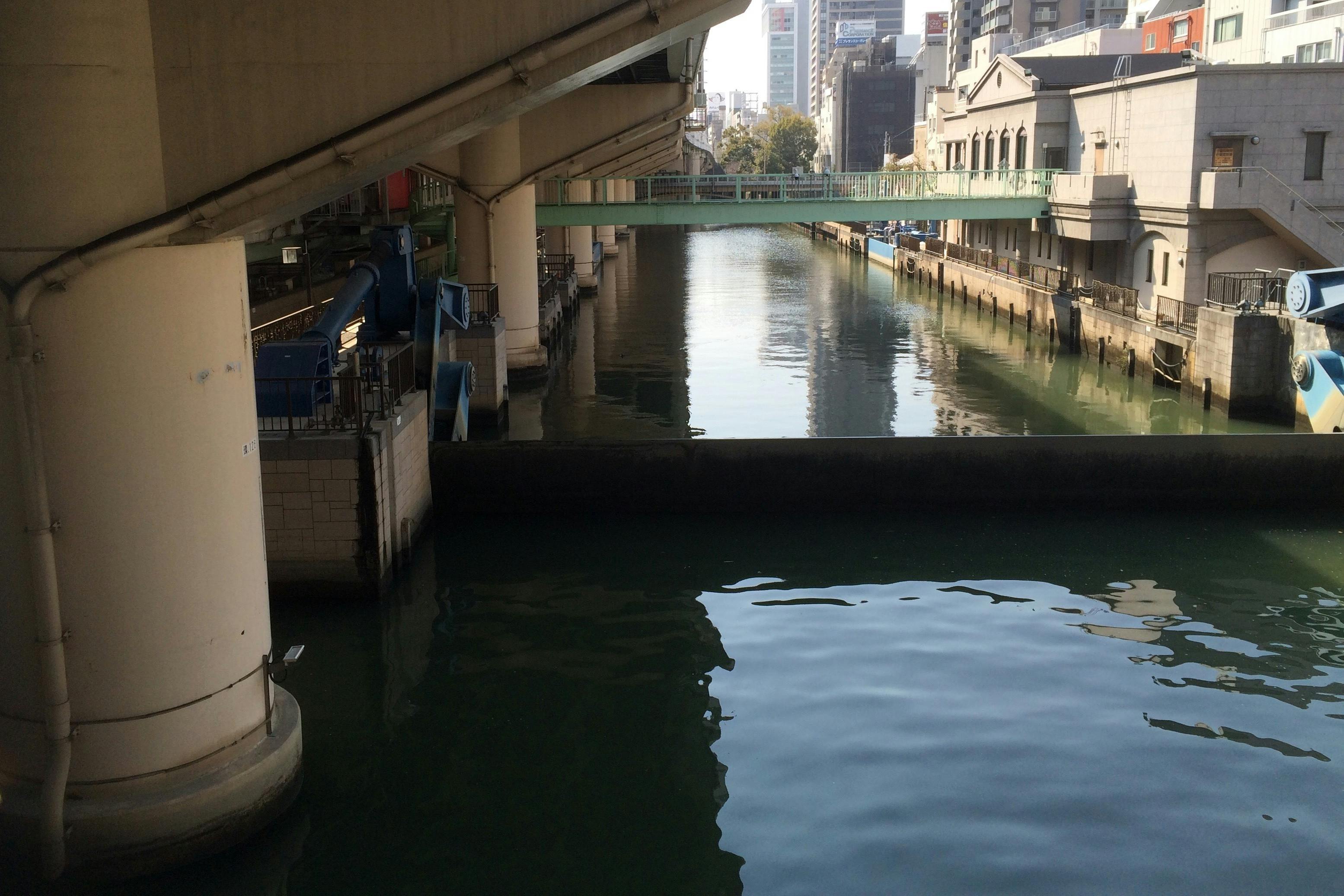 高麗橋の下は東横堀川です。昔は大阪城を守る堀でした。左側は阪神高速道路の橋脚です。