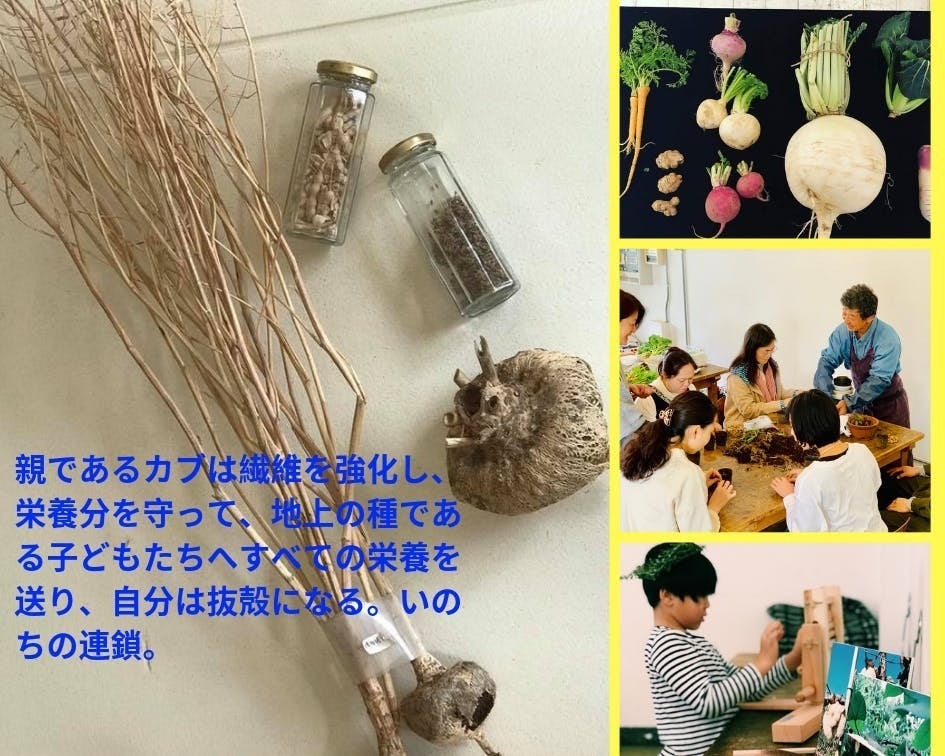 1月は「種」でした。自然の野菜は繊維を強化し自分の栄養分を守って、花が咲き終わってできた種(自分の子ども)にすべての栄養を送り、自分は抜け殻になります。それがいのちの連鎖であり、親は子のためにすべてを捧げる。そして私たち人間は、親1つ分のいのちやどの子どもたちすべてのいのちを、食事としていただくことで生きています。