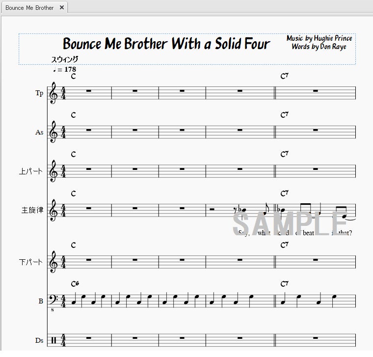 今回は、リンディホップ業界では有名な曲『Bounce Me Brother With a Solid Four』(The Andrews Sisters)の楽譜を作ります!