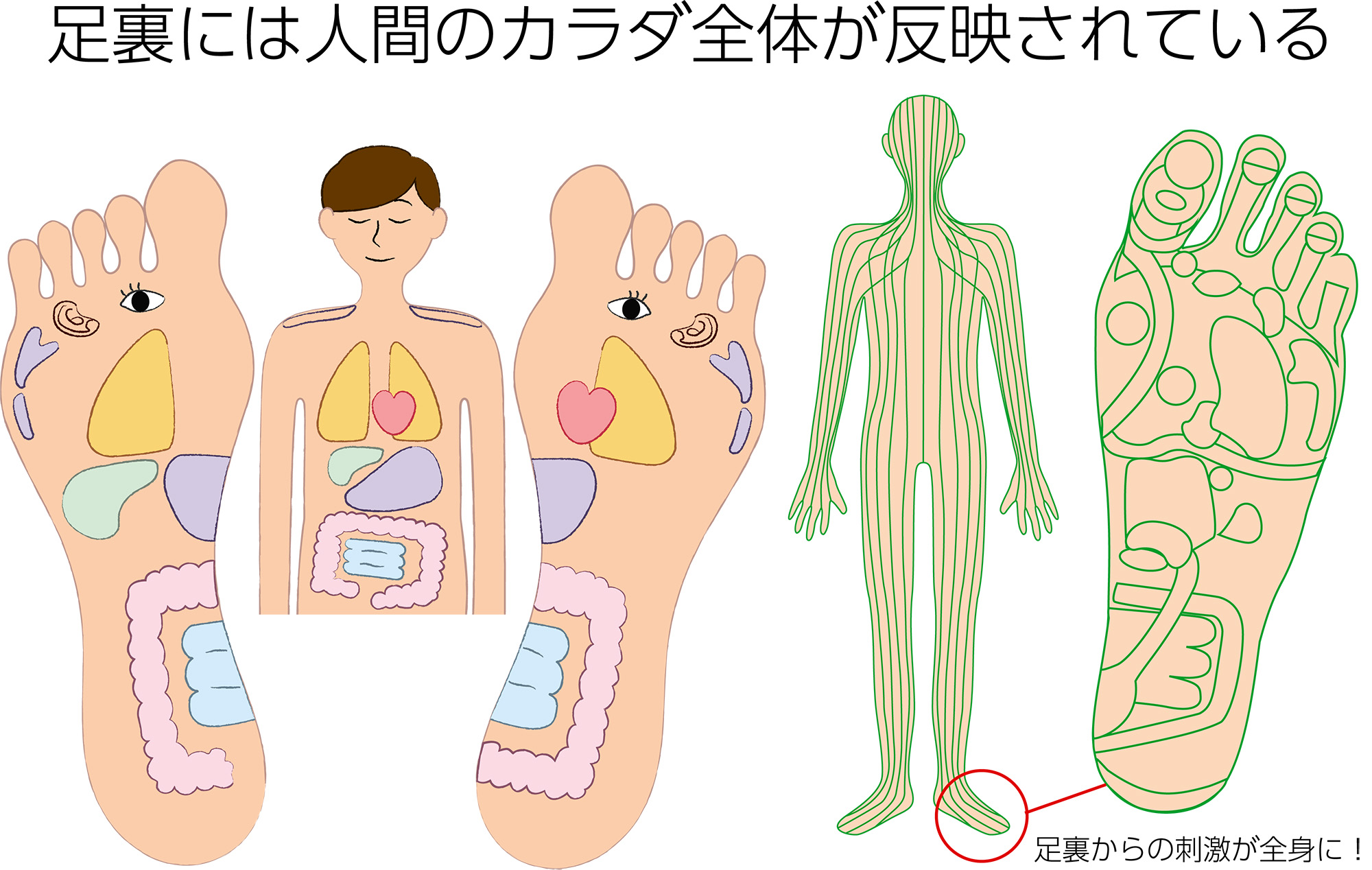 リフレクソロジーには「足裏には人間のカラダ全体が反映されている」という考え方があります。足裏を刺激することで、文字通り全身の様々な部位に反射させるというのが、足裏リフレクソロジーの考え方です。