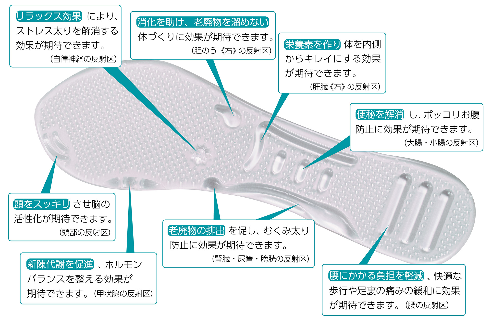 下図は、「ダイエット&インソール」の形状(突起)がどの反射区を刺激するか、またその反射区を刺激することでどんな効果が期待できるのかを解説したものです。