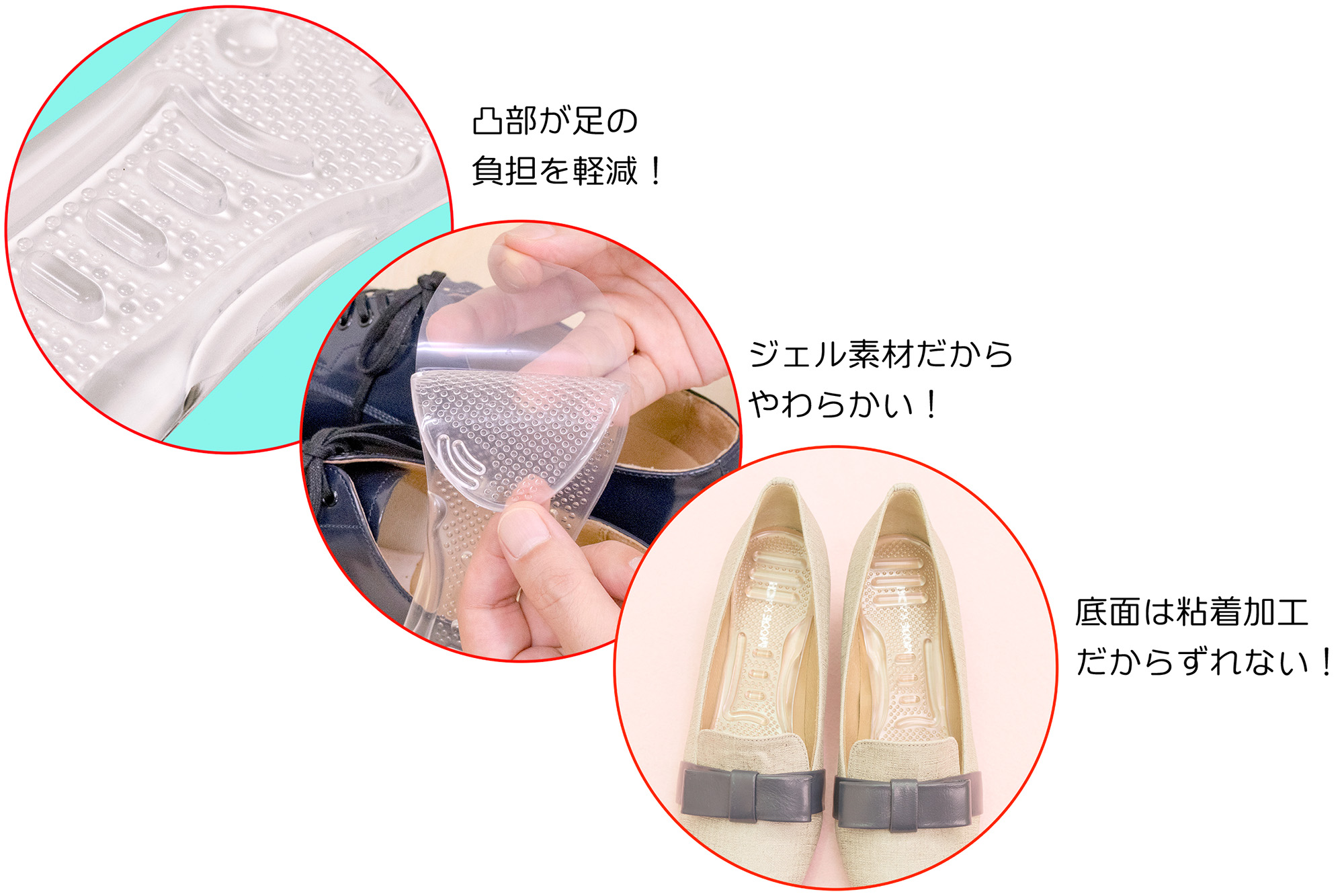 足裏リフレクソロジーの有名ブランド店「クイーンズウェイ」さんの監修で、靴に入れるだけで「やせる反射区」を刺激する画期的なインソールを開発しました。やわらかいジェル素材のインソールで、靴を脱いでも目立たない無色透明、底面が粘着素材なのでズレも防止できます。