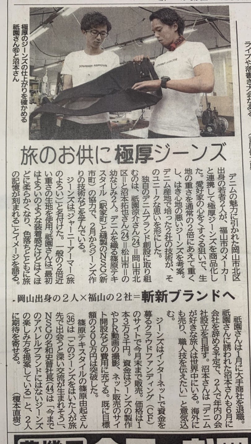2019/05/21 15:21クラウドファンディングを開始して1ヶ月。5/16の中国新聞朝刊にJOURNEY ARMOURの記事を掲載して頂きました。応援して頂いている産地の皆さんの為にも残り10日、精一杯活動していきたいと思います!新たな目標の300万円まであと少しです。ご支援・拡散のほどよろしくお願い致します。 もっと見る