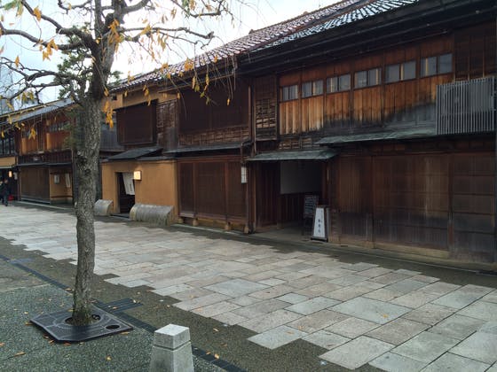 「にし茶屋街」は、ひがし茶屋街、主計町茶屋街と並んで、金沢三大茶屋街のひとつに数えられていて、いまでも一見さんお断りの花街で、伝統的な出格子の茶屋様式の家並みが続きます。にし茶屋街には、3つの茶屋街の中でも一番多くの芸妓さんがいるそうです。
